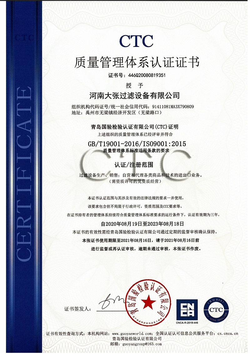 2020年9月9日——河南大張過濾設(shè)備有限公司榮獲“高新技術(shù)企業(yè)”證書