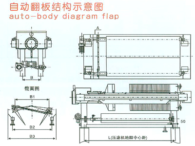 壓濾機(jī)濾板下方裝置了兩塊協(xié)調(diào)工作的翻板,在過濾過程中處于閉合狀態(tài),將滴漏的液體或?yàn)V板沖洗水導(dǎo)入兩側(cè)的集液槽。卸料時(shí)處于開啟狀態(tài),起到導(dǎo)泥作用。